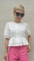 パンチングレースを全面に仕様したペプラムブラウスです。