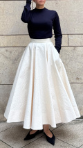 驚くほどの立体感をお楽しみいただけるジャガードスカートでございます。 どの角度から見ても異なる美しいシルエットをご実感いただけるスペシャルな一枚に仕上がりました。 細部にもこだわりウエスト部分にはグログランを施し、さりげないアクセントに。 左右には深めのポケットしっかりとついております。 着るだけで不思議といつもの自分よりも自信が持てるような一着となっております。 きれいめなシューズだけでなく、スニーカーやエンジニアブーツなどとのコーディネートもおすすめでございます。 別売りのリボン風ジャガードトップスとセットアップでお召しいただけます。