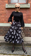 重厚感のある生地をたっぷり使用しているので、手に持つとクラシックな重みを感じますが、身に着けると、その重みがシルエットの美しさに変身する不思議なスカートになっております。