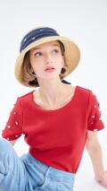 袖に散りばめられたビジューがさりげない華やかさを演出してくれるトップスでございます。