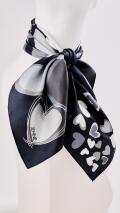 様々な大きさのハートが散りばめられた柄が印象的なスカーフでございます。