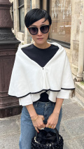 ショール部分は裾が配色デザインとなっている生地を二枚重ねて、より立体的なアクセントを感じていただけるデザインに。