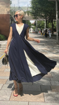ロングカーディガンを羽織ったようなデザインが特徴的で、前身頃のホックを外すと中にホワイトのワンピースを着用していようなスタイリングでお楽しみいただけます。