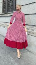 ストライプ柄と無地の生地を大胆に切り替え、パッと目を引くワンピースに仕上げております。