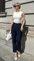シンプルでスッキリとしたシルエットに表面感のある生地を使用し、いつものパンツスタイルもワンランク上の雰囲気に。