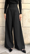 ウエストデザインがポイントのワイドパンツでございます。 男性がタキシードなどの正装時に着用するカマーベルトをイメージしてウエスト部分をデザインいたしました。 幅広なベルトデザインがウエストをスッキリと見せてくれ、ハイウエストで着用することで驚くほどの脚長効果もご実感いただけます。 脚がまっすぐ長く見えるシルエットで仕立て、ピンストライプ柄でクールさと落ち着きをさらに演出してくれます。 デザインだけでなく、シワになりづらくサラリとした大変穿き心地のよい生地を使用しているのも特徴でございます。 きれいめからカジュアルまで様々なシーンでお召しいただける美脚ワイドパンツでございます。